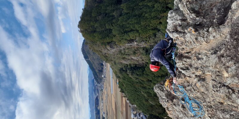 岩が脆いのでロープで落石を発生させないための中間支点の取り方や、