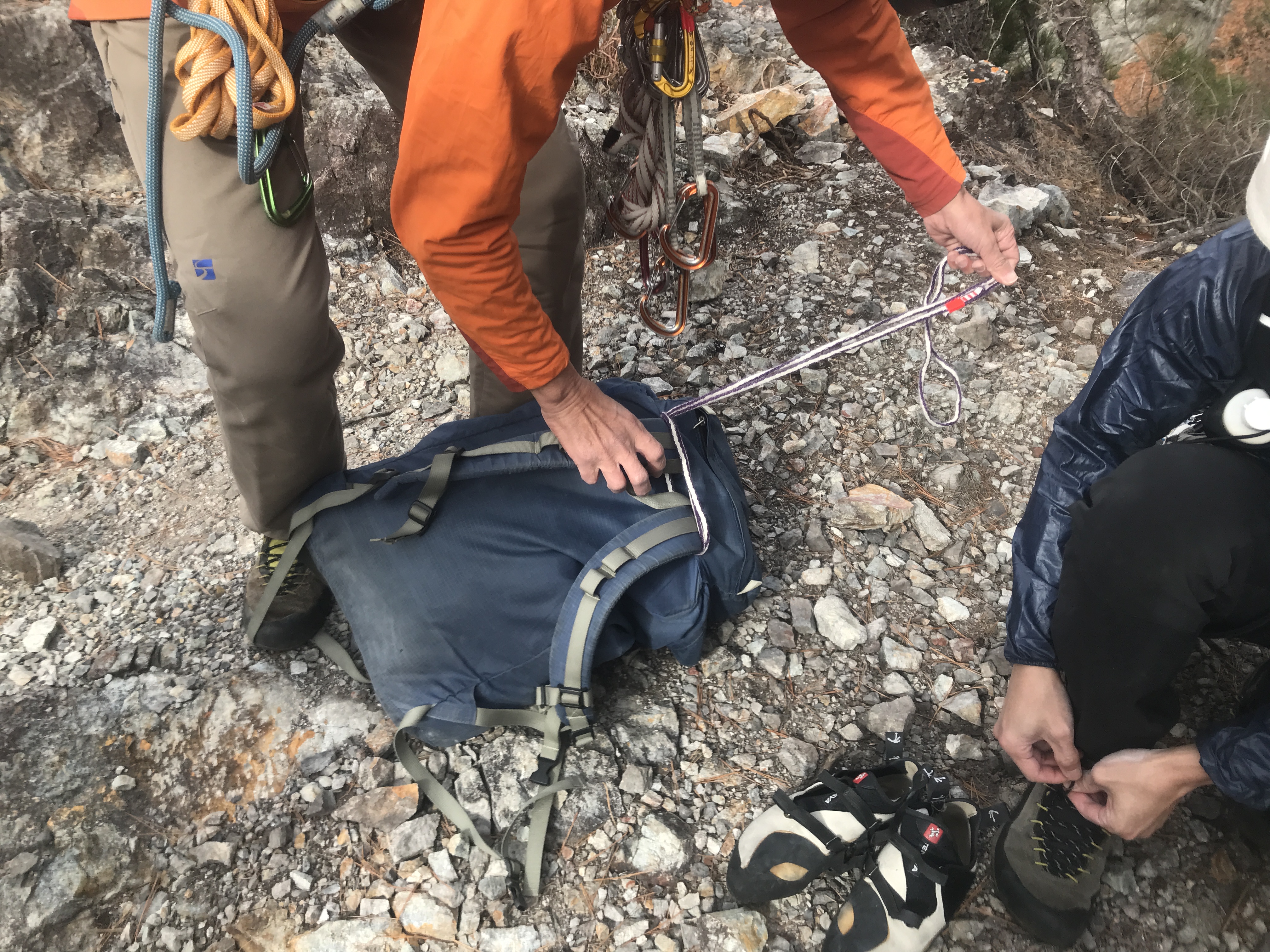 リード&フォローなので、登るルートをイメージしてどのギアを持っていくのか(置いていくのか)、