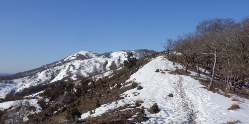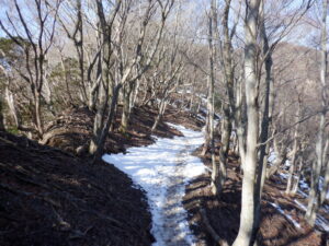 尾根上にあがったところでやっと少しずつ雪が出てきますが、だいぶ腐った雪で気を付ければアイゼンなどは使わずに歩けました。