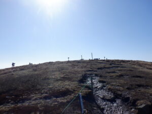 駐車場から2時間半ほど歩いて、頂上へ。ここはいつも風が抜けて雪が飛ばされていることが多い。