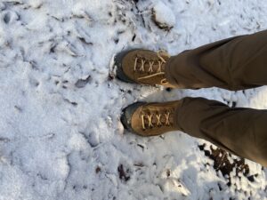 朝の出来事など話しながら、雪道を歩いて道樹山へ。