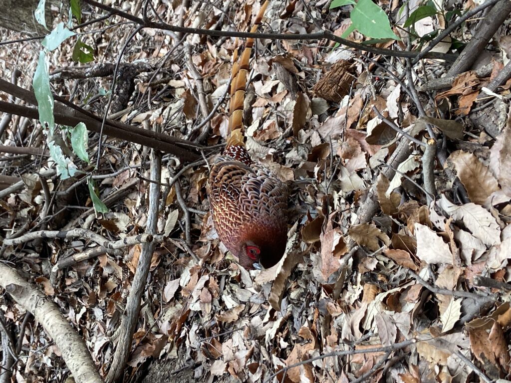 今回ヤマガラに餌をやるのも楽しみで、たくさんクルミを持参したが、あげることが出来なかったので、下山途中に出会ったキジ?に餌をあげることに。全く逃げないので、驚きました!