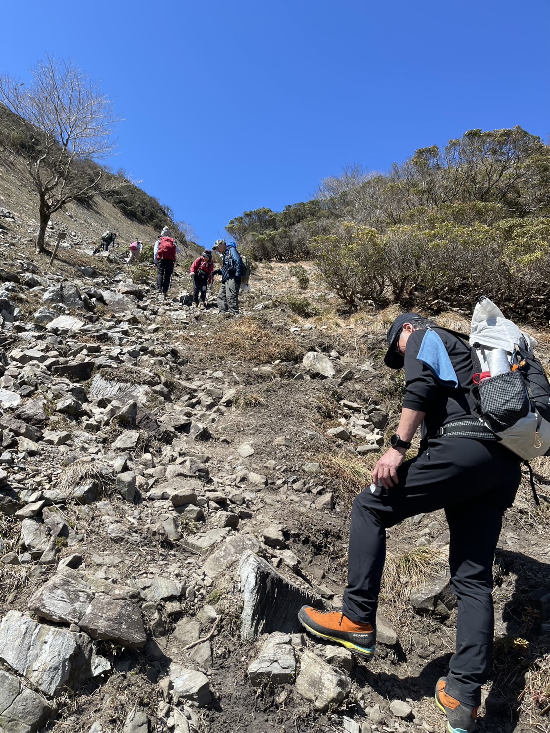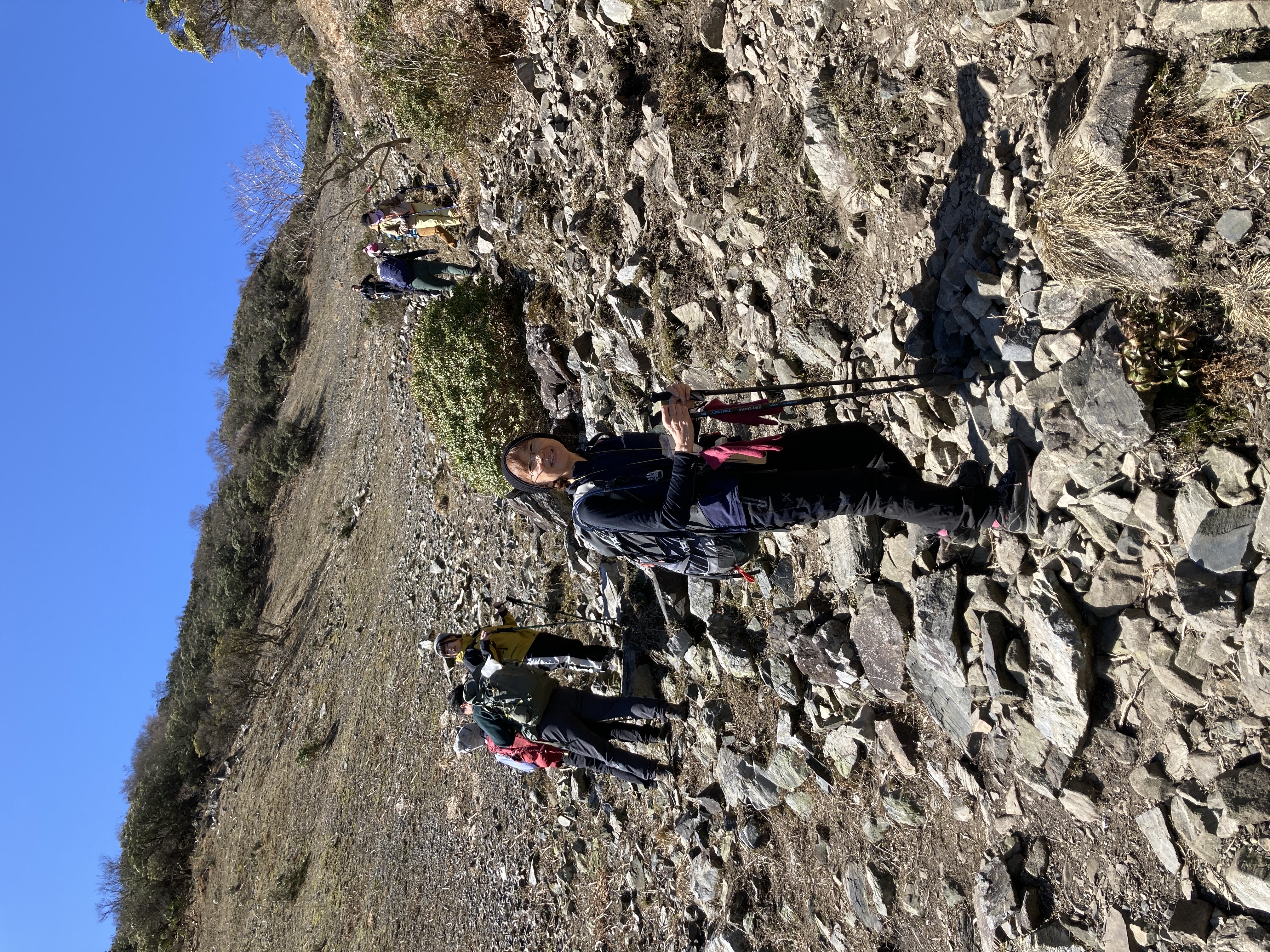 山頂は多くの登山者でにぎわっていましたが、ただ、風が強く、皆さん風を避けてお昼ご飯を食べていました。我々も風を避け、ささっとおにぎりを食べて、下山しました。