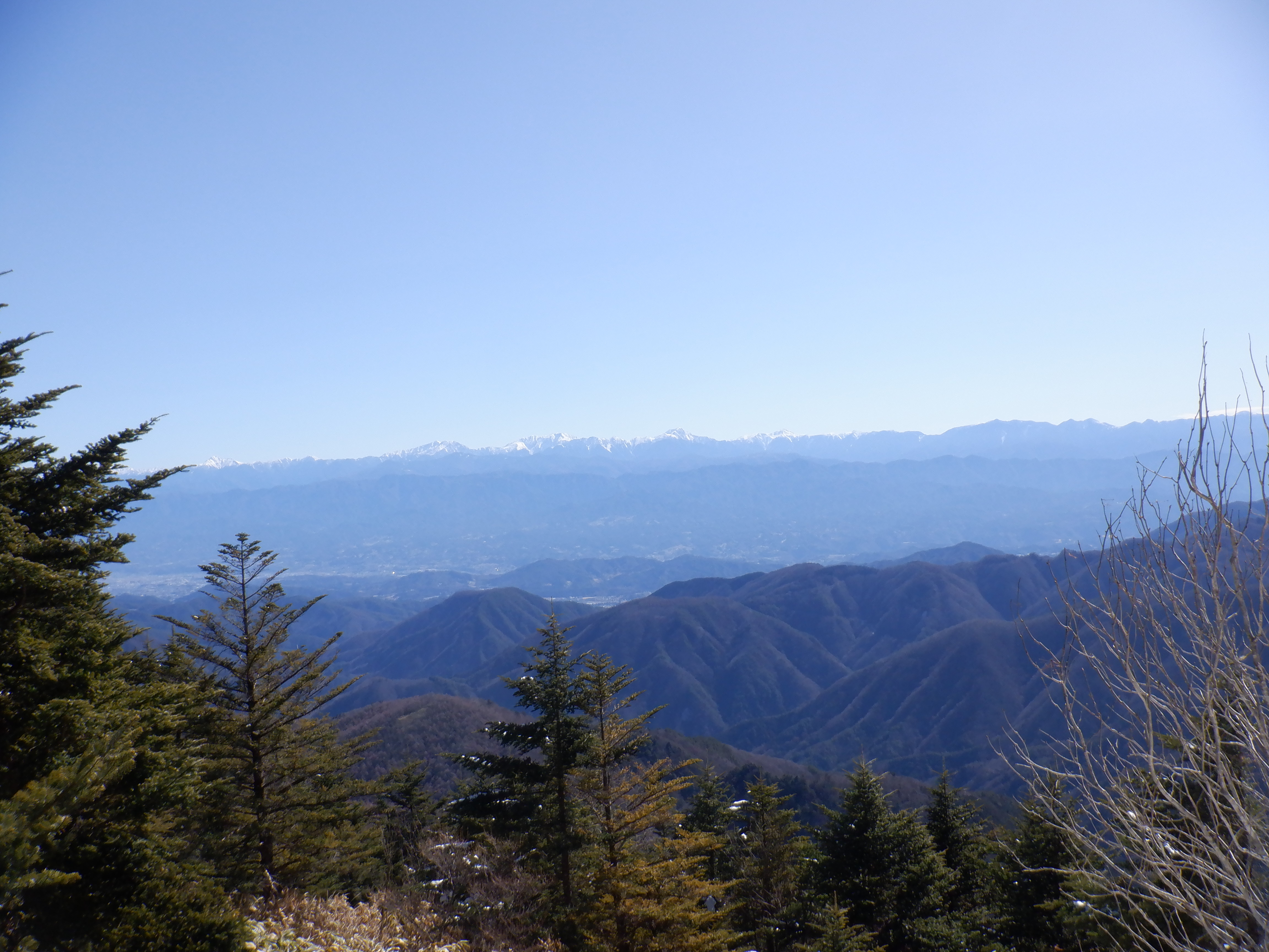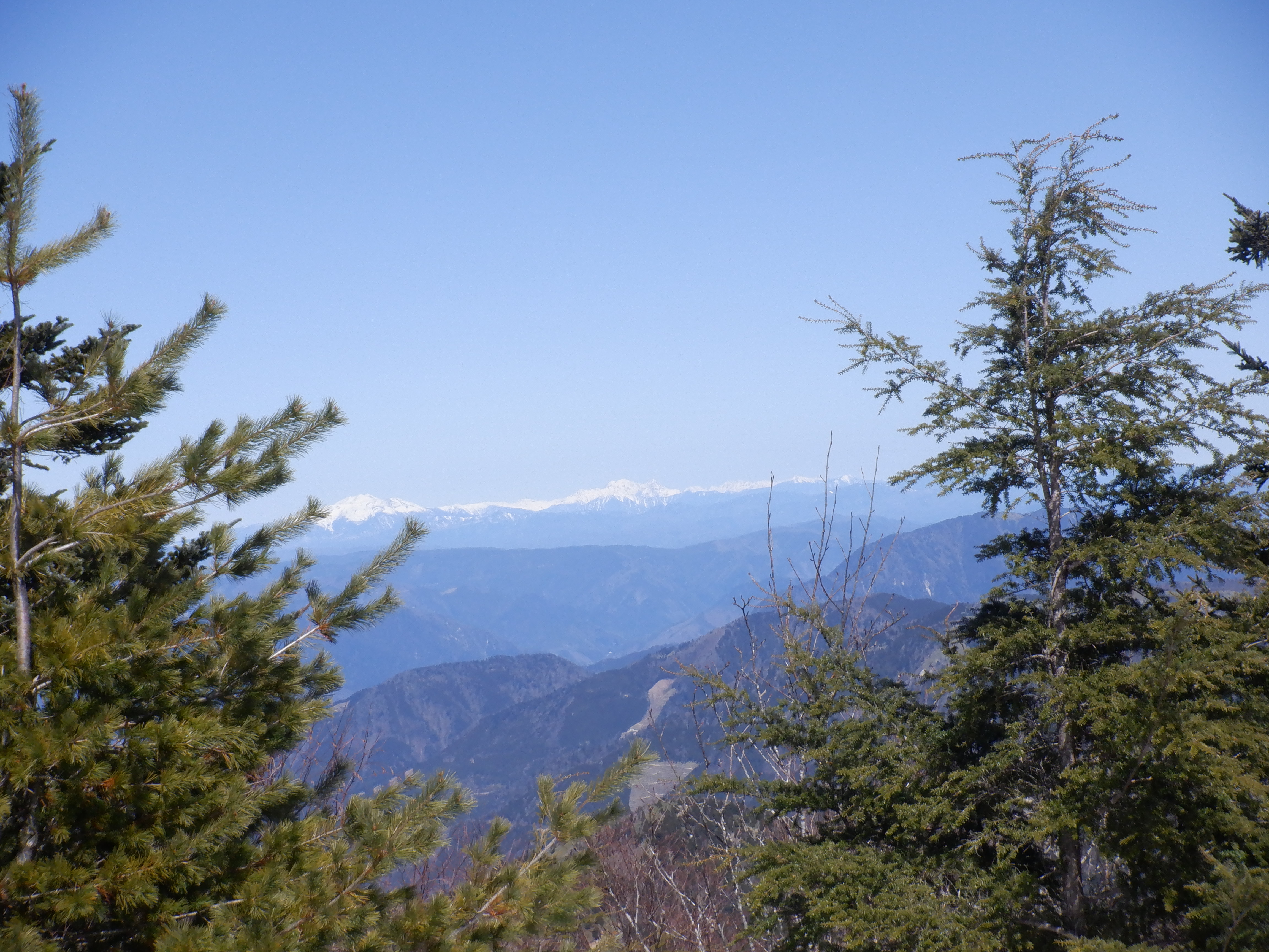 1,900m付近の切り開きに来ると、伊那谷の向こう側、真っ青な空に南アルプス全山がパノラマのように見えた。景色的にはこのあたりがハイライトだろう。