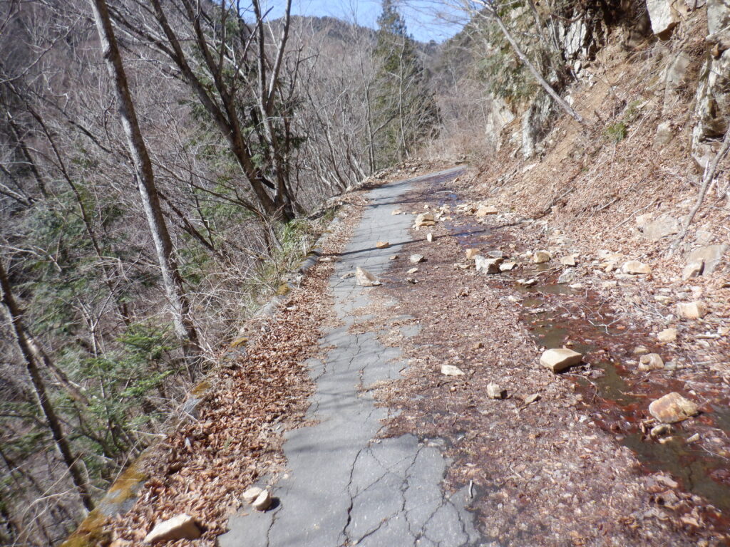 ゲート前に着いたら、車が停まっていた。もう通行止めはしていないようで、こんなことなら車でここまでくればよかった、と思いつつ気を取り直して先に進む。下は帰りに撮った写真だが、ゲートから先は荒れ放題で、落石がけっこうあるので注意。歩いていても落石の音はしていた。