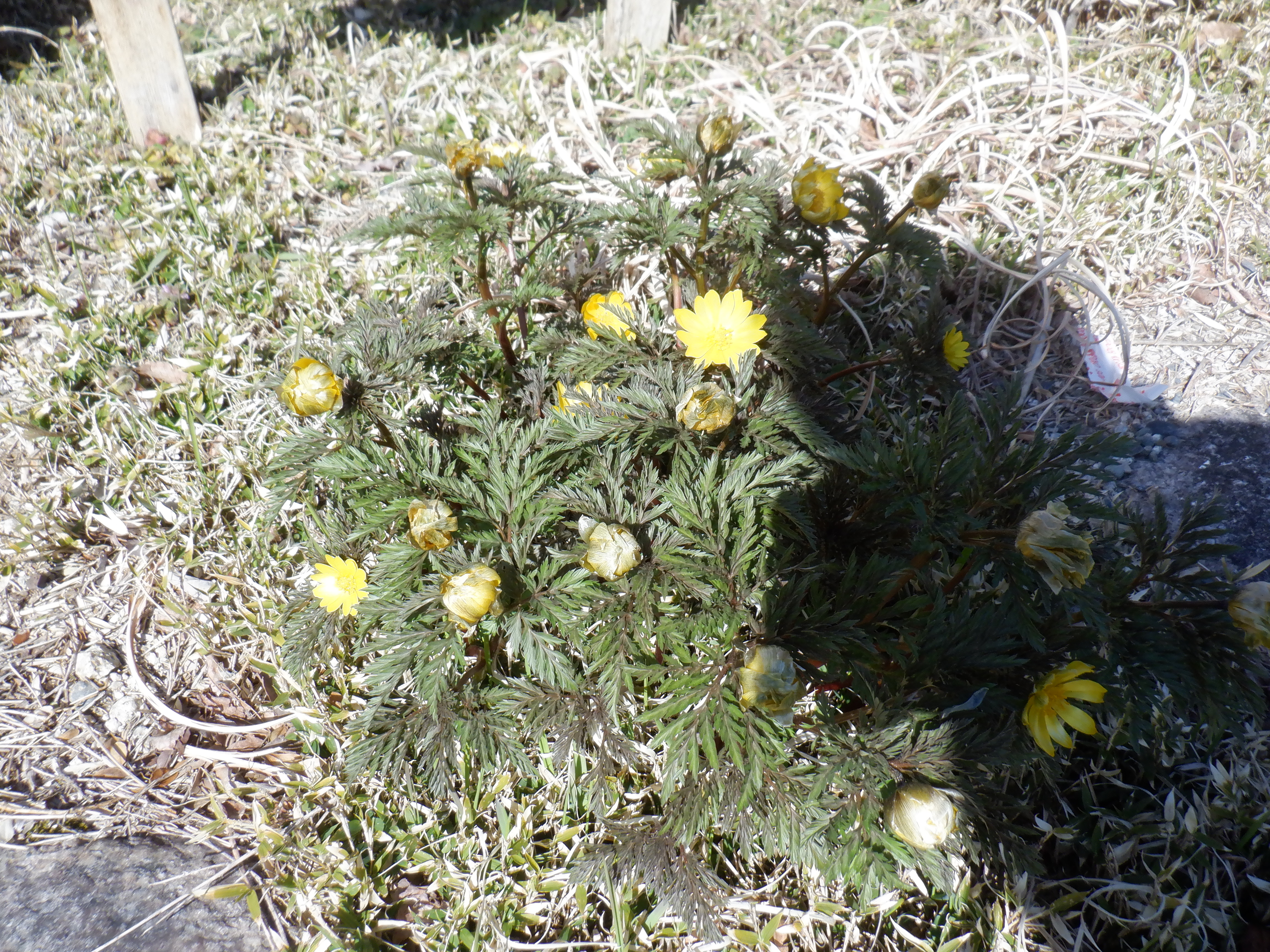 おお、珍しいと思って写真を撮ったが、周りに大量に咲いていた。福寿草は好日性があって、ひまわりのように花が太陽を追って動くらしい。よく見ると、周りの福寿草はけなげに太陽の方を向いていた。