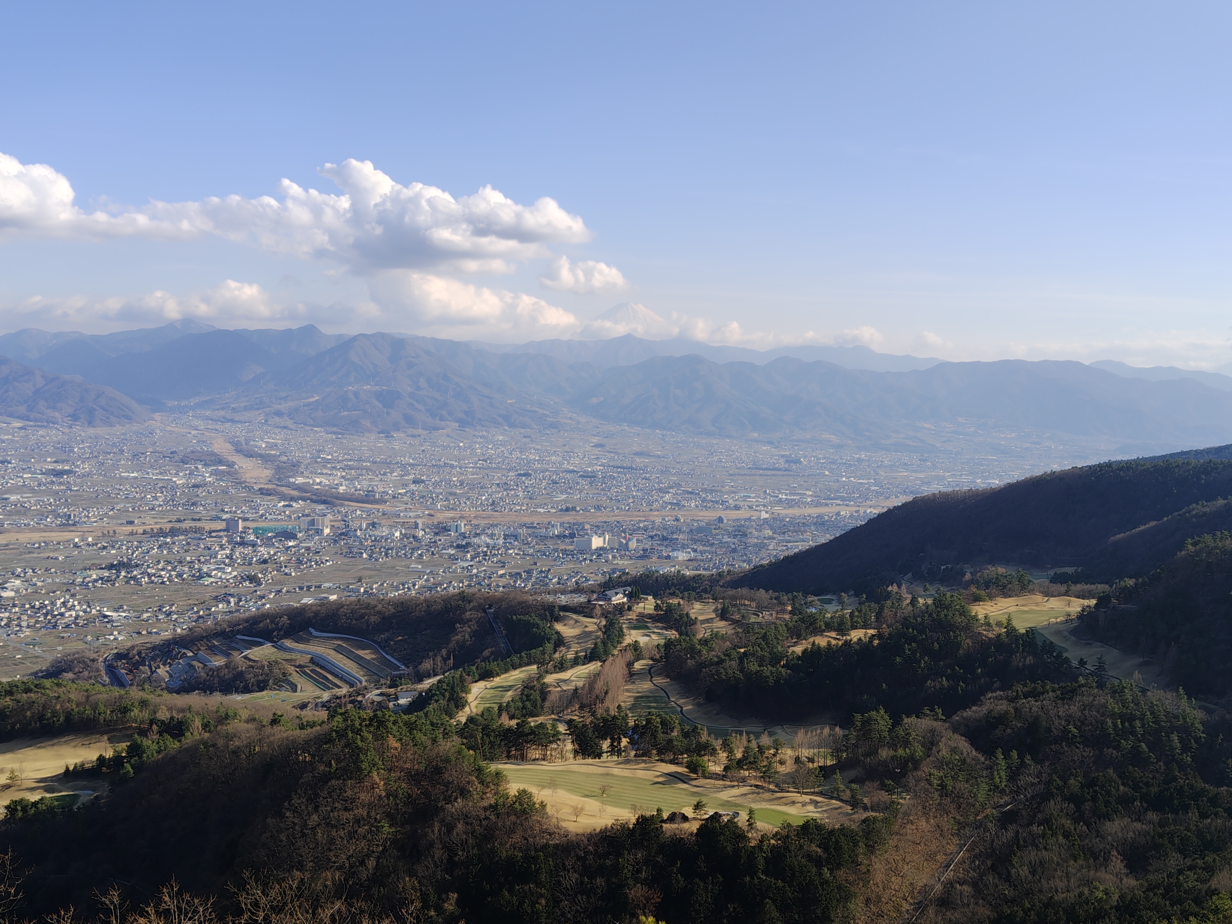 岩の上に立って振り返ると、甲府盆地の向こうの雲の中に富士山が。わかりにくいけど、じっと見ると見えてくるはず。