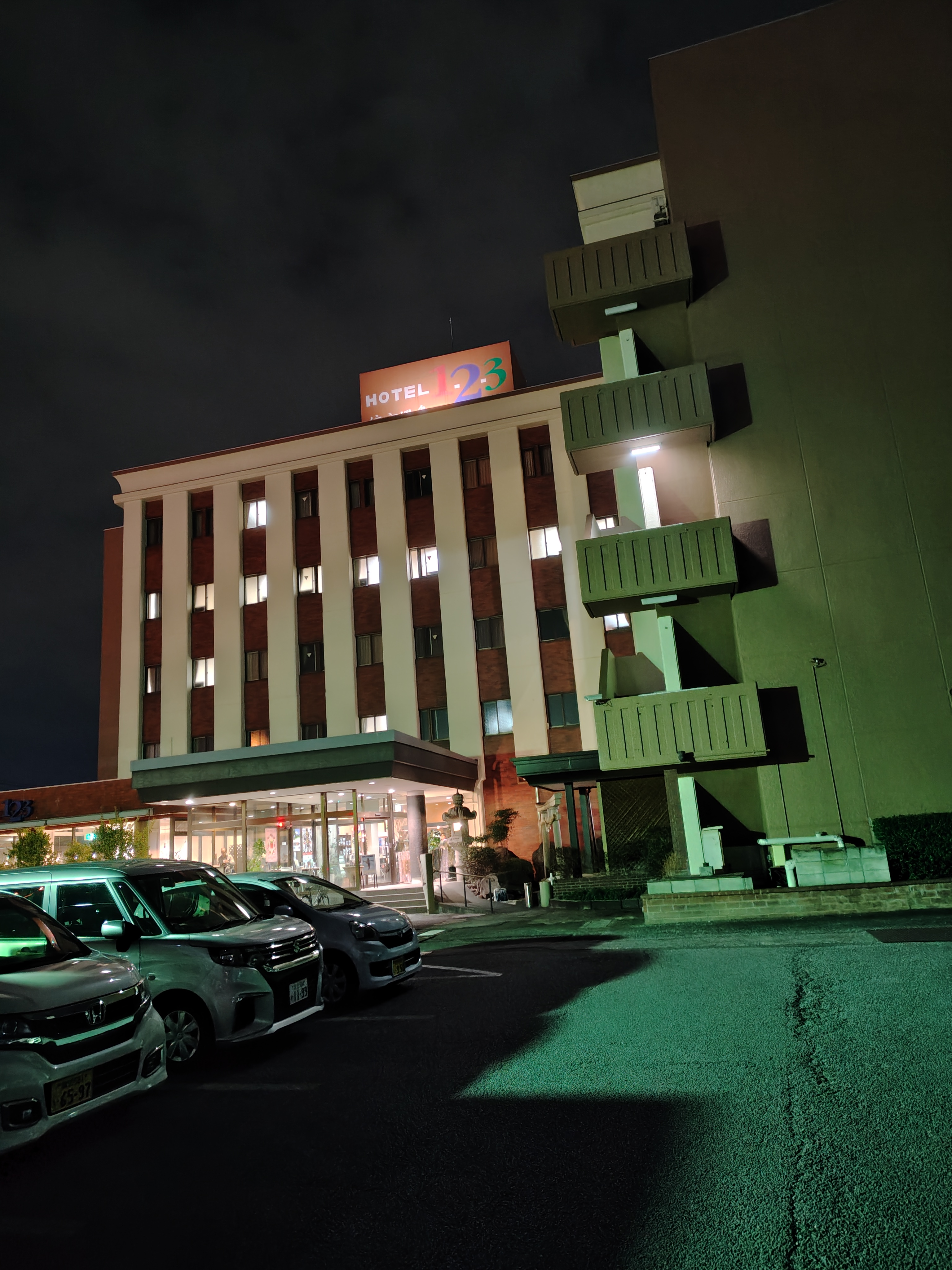 夕方近くまで遊んで、この日は岩場から車で30分ほどの甲府市内のビジネスホテルで泊まりました。「ホテル1.2.3」。昭和な感じのビジネスホテルでした。ビジネス客だけでなく家族連れもけっこういた。温泉大浴場、朝のバイキングと夕方の軽食もついてリーズナブルだからか?