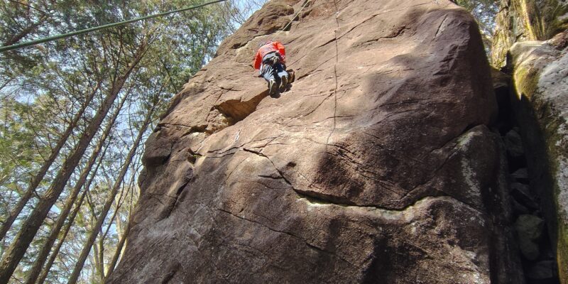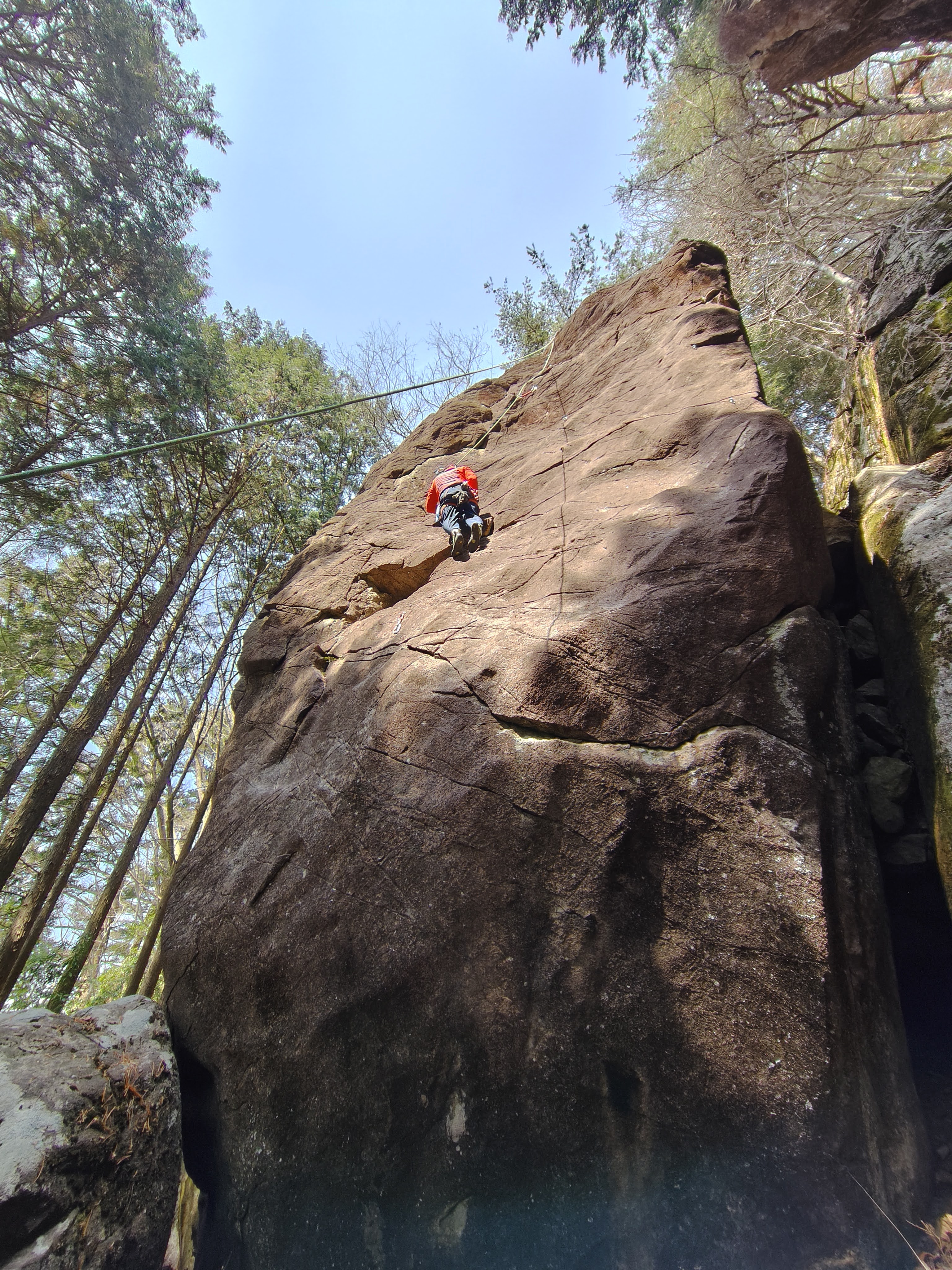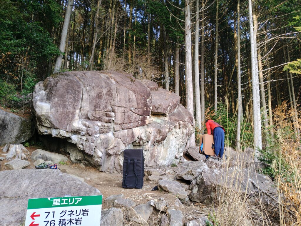 さっそく石盤岩に向かい、右から順番に登る。Iくんはさすがに20代とあって、体幹がきいた力強い登りだ。うらやましい。