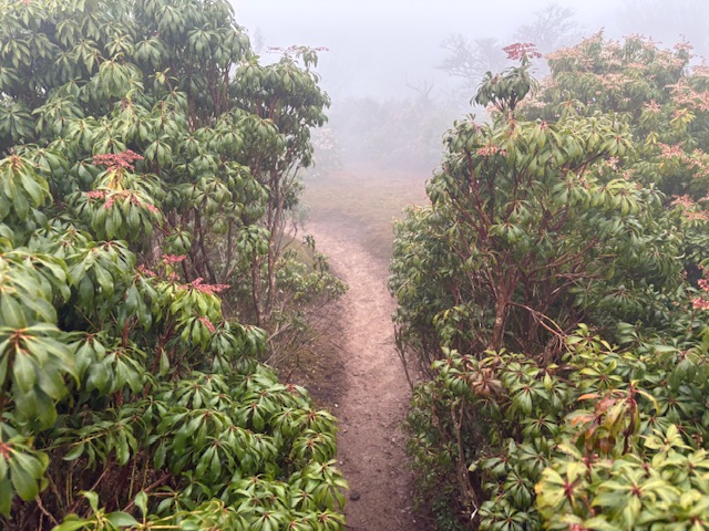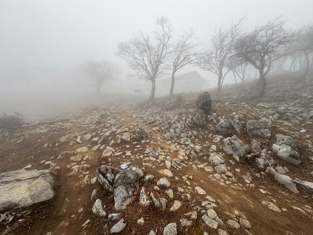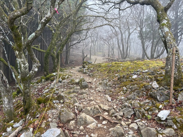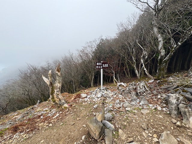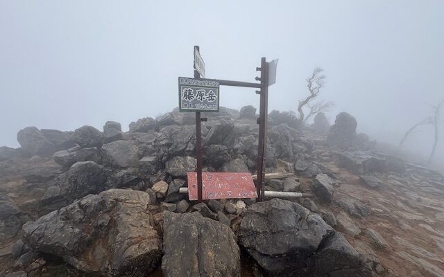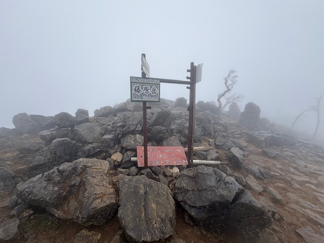 9合目に到着して、藤原の稜線に出ます。事前に調べてた情報では、雨の日は稜線から強風とガスで視界が悪くなるとのことでしたが、その通り、強風とガスでした。笑