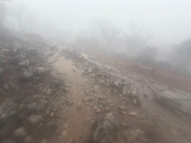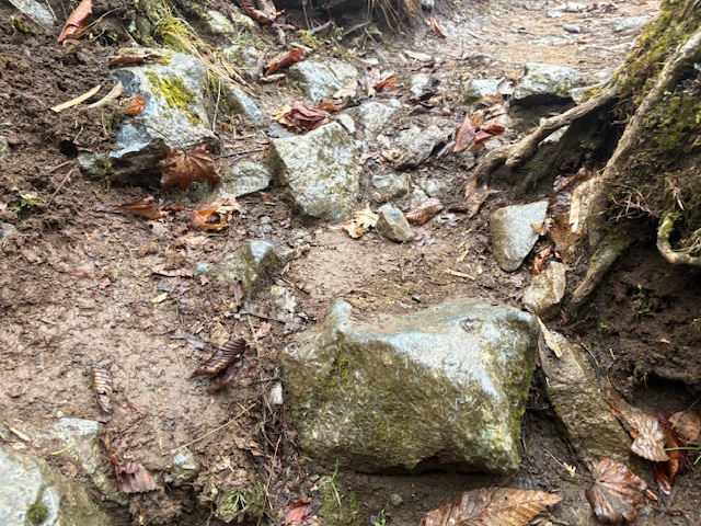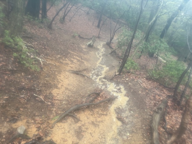 さて、折り返し。帰り道は、山頂から登山口まで御覧の通りのよう小川状態でしたw 想定はしてたので、すごい滑るのかと思って、ストックも準備しましたが、特に必要ありませんでした。ぬかるみよりは岩が滑りますね。とはいえ、沢登りで滑る岩を見分けて歩いたりするのと比べるとどうってことないので、サクサク下山します。