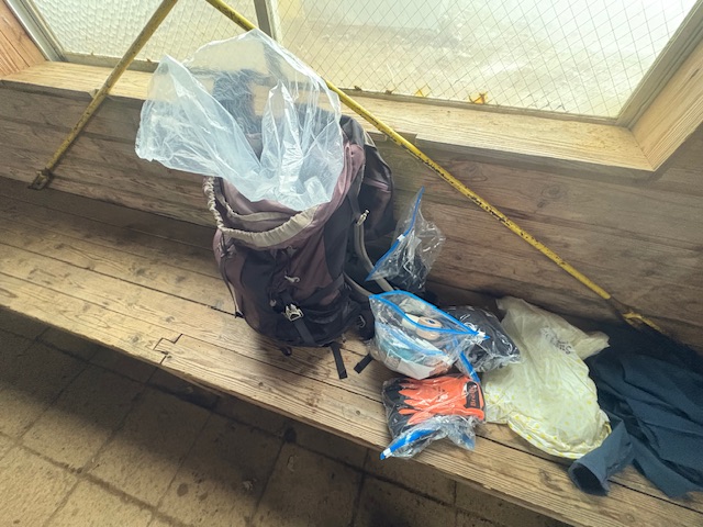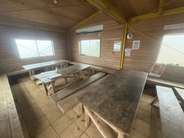 そして、山頂から降りてきて、さきほどの避難小屋に到着。めちゃくちゃ立派な避難小屋。2階もあって、ここで休むこともできそうです。