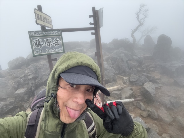 藤原は人気の山でいつもごった返してるイメージですが、この日は誰もいません! 独り占めの山頂~~~!!!ここに来る過程も雨風が強くアグレッシブだったので、いつも以上にテンションがあがります。