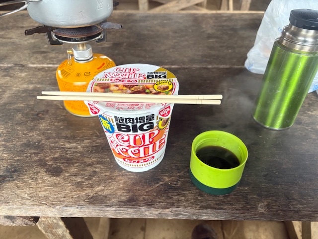 そして、お昼ごはんを頂きます。体も雨で冷えてるんで、こういう日はやっぱり暖かいものに限る~~ってことで、定番のカップヌードルとホットコーヒー。癒されます。笑